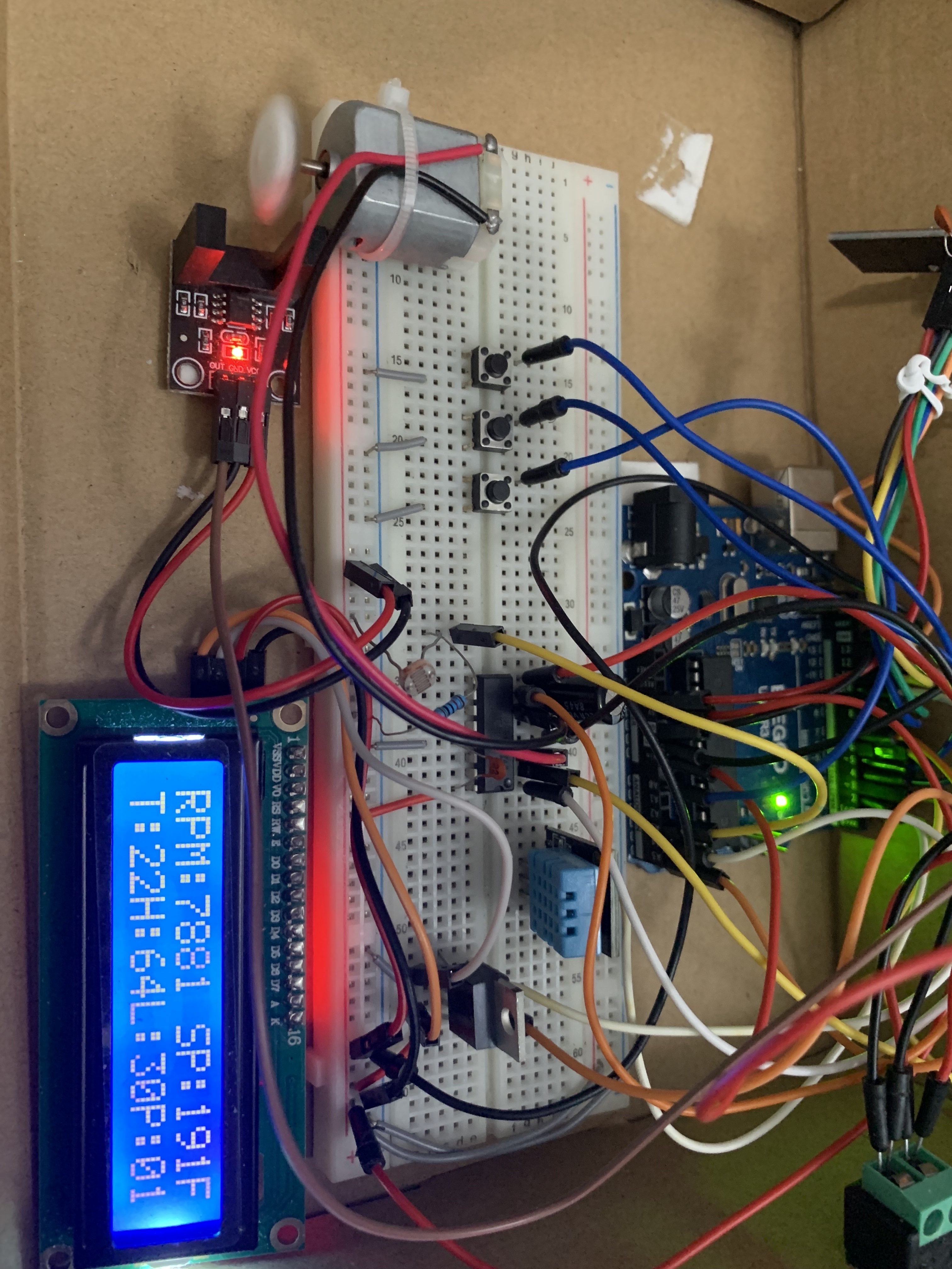This project is a custom electronic speed controller (ESC) system built using two Arduino microcontrollers, designed to provide precise and stable motor speed control using closed-loop PID control with motor speed feedback. The system measures motor speed in real time using an infrared (IR) sensor and encoder, allowing the controller to continuously adjust the motor output to maintain a desired RPM. The design emphasizes smooth motor behavior, reliable feedback, and flexibility between manual (non-PID) and PID control modes. The picture below shows the receiver side of the project.