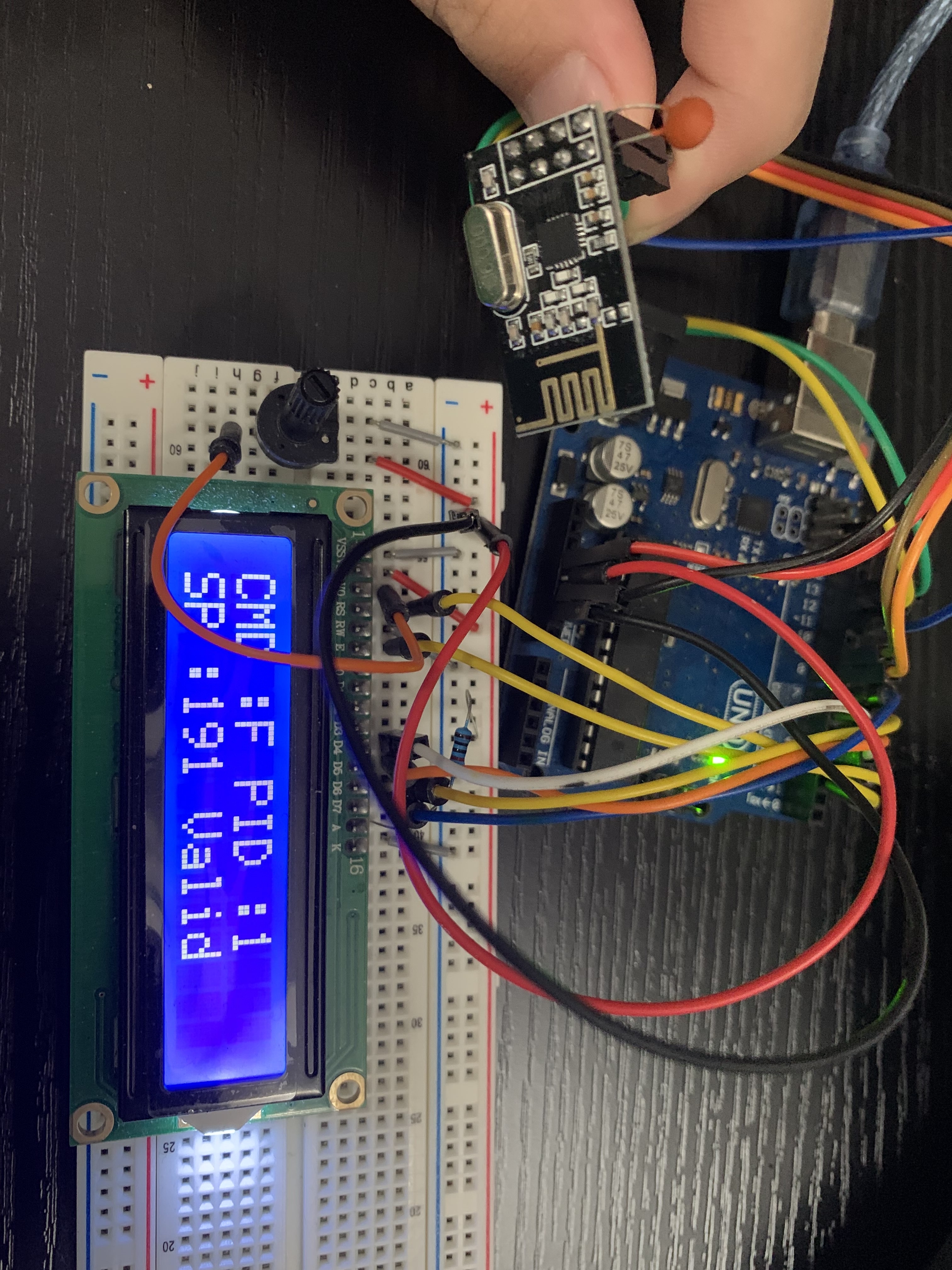 Control commands are transmitted wirelessly using an NRF24L01 radio module. The system supports multiple operating modes, including direct setpoint control and PID-controlled operation. Local pushbuttons on the receiver allows the user to override the wireless PID enable signal, cycling between forced PID on, forced PID off, and radio pass-through control. This ensures safe and predictable behavior even if communication is lost or manual intervention is required. The picture below shows the transmitter side of the project.
