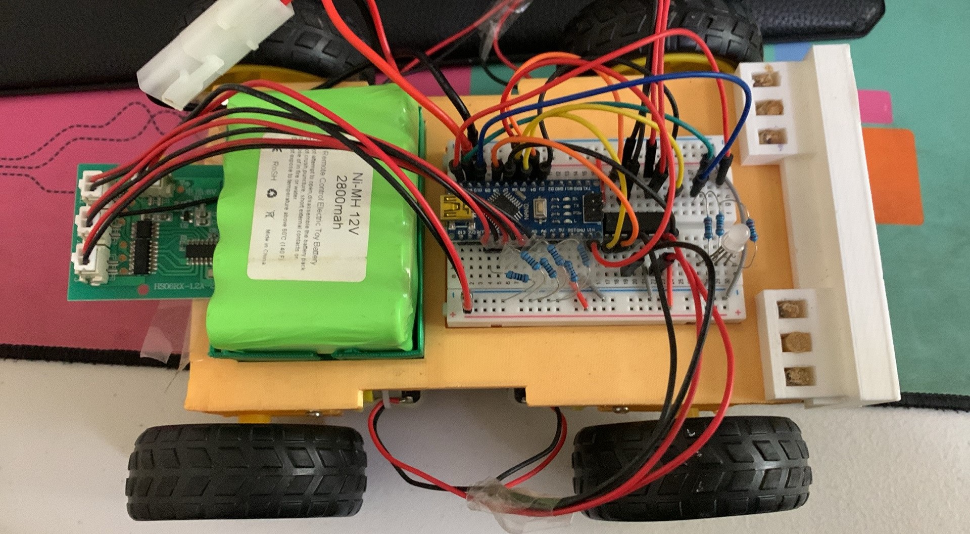 The car features four independent 12V motors, one for each wheel, providing robust and responsive motion. These motors are driven by the L293D H-bridge chip, which allows bi-directional control and speed modulation via PWM signals generated by the Arduino. Thus, two motors on each side of the car can be controlled separately , allowing it to mimick the movement of a tank, as well as, a responsive driving experience with no turning angle. Powering the setup is a 12V rechargeable lithium-ion battery pack, which fits snugly on the 3D-printed base, ensuring portability and ease of use. The modular design ensures all components are securely fastened and protected during operation.