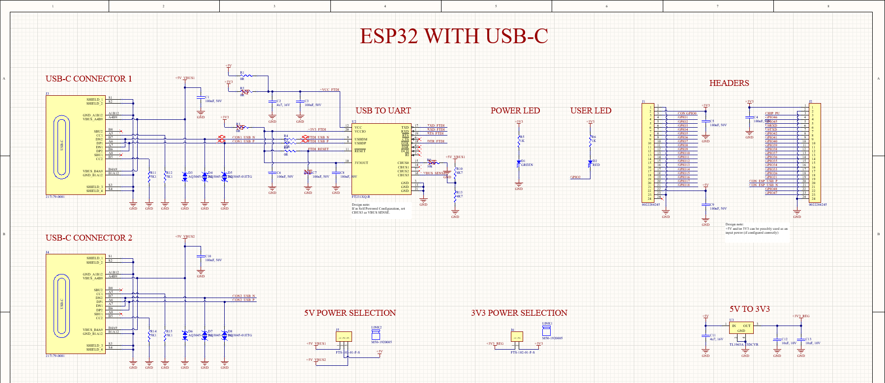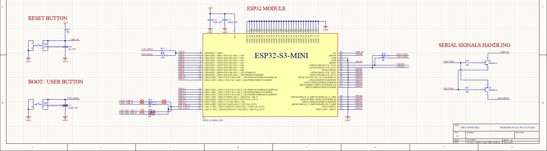 This project involved the complete design of a manufacture-ready, four-layer printed circuit board (PCB) centered around the ESP32 microcontroller, using Altium Designer as the primary CAD tool. The work began by completeing the schematic, where the circuitry is separated into functional blocks such as power regulation, USB communication, programming interface, and core microcontroller connections. Custom schematic symbols and PCB footprints were created and verified against manufacturer provided datasheets and common industry practices to ensure dimensional accuracy, readability and pin compatibility. Throughout the design process, each component's datasheet recommendations were followed, particularly for USB-C connection ports, USB to UART module, microcontroller's power and ground routing , as these directly affect reliability and performance in real hardware.