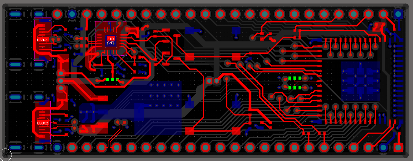 A critical design decision in this project was the use of a four-layer stack-up consisting of Top Signal, 3.3 V Power, Solid Ground Plane, and Bottom Signal layers. This controlled stack-up improves signal integrity, and routing efficiency by providing space for both wider traces for high amperage power paths and shorter paths routed away from power paths which reduces electromagnetic interference (EMI). The dedicated ground plane reduces noise coupling and ensures stable reference voltages, while the internal 3.3 V power layer improves current distribution and reduces voltage drop across the board. This structure is especially important for the ESP32 and USB interfaces, which operate at relatively high frequencies and are sensitive to poor grounding.