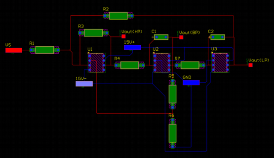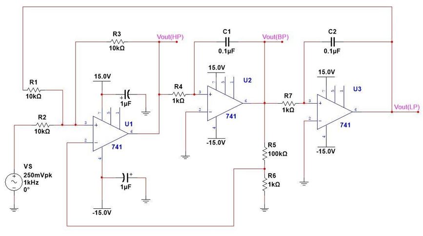 This project implements a state variable filter (SVF) using three operational amplifiers to generate high-pass, band-pass, and low-pass outputs from a single analog circuit. Each op-amp stage performs a specific function, and together they form a flexible filtering system whose cutoff frequency and response are set by resistor and capacitor values. Because all three filter outputs are derived from the same internal signals, they remain mathematically related and consistent across the entire circuit.