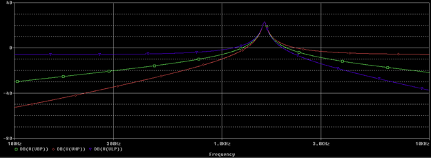 The SVF design allows multiple filter responses to be accessed simultaneously without requiring separate circuits for each type. By adjusting only a few component values, such as the internal resistors and capacitors, the filter’s cutoff frequency and quality factor can be easily tuned while maintaining stable and predictable performance. This makes the circuit well-suited for applications such as audio signal processing, synthesizers, and control systems, where flexibility and efficiency are important. The following graph shows the simulated results of the SVF circuit, where the blue signal shows the low-pass , green signal shows the band-pass, and the red signal shows the high-pass filtered results in the DB scale.